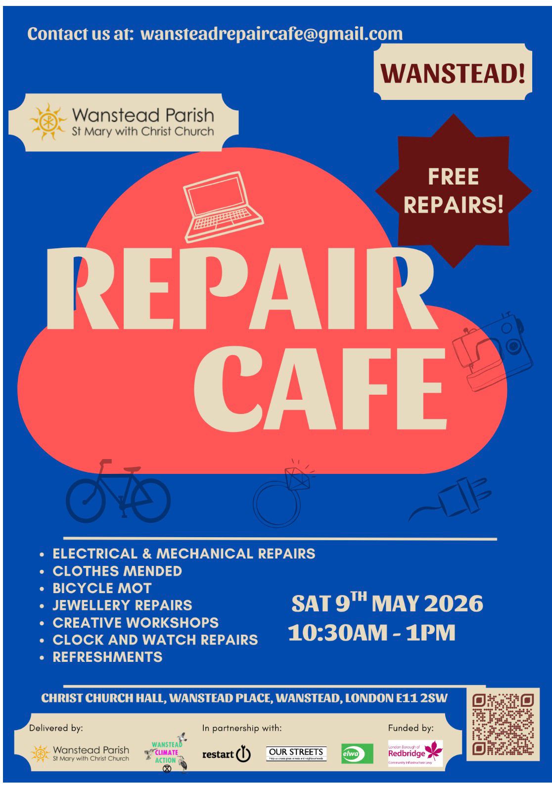Following on from our first pilot Café in October 2024, Christ Church parish partnered with Wanstead Climate Action to host four Repair Cafés in Wanstead a year. The next is on Saturday 7 March 2026 from 10.30-1pm at Christ Church Hall, Wanstead. This is the chance to fix clothes and gadgets that have been hanging around while you decide what to do with them. Remember ‘repair’ comes before ‘recycle’! (Except in the dictionary but even there ‘repair’ is before ‘throw away’!)