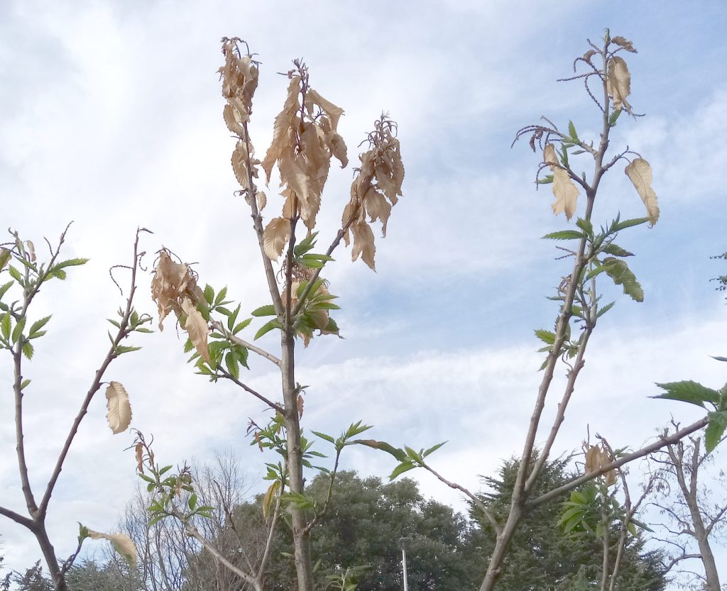If you concentrate on trees where 90-95% of leaves have turned brown, it seems they could survive, and presumably only need water to support the remaining fraction, so making them realistically manageable to support until the rains come. It might also make sense to prioritise stressed oaks and other slower-growing trees with greater biodiversity. As Marian wrote, it’s theoretically only whips and saplings with a mere year or two of roots that can be killed by a single year’s drought; this year it seems we need to pay equal attention to semi-mature trees that would take so much longer to replace. If they have a crown and root system covering 10 sq m, then 1 mm of light rain equates to 10 litres from a watering can. For larger trees, you can often find a spot against the trunk or between the roots where water is absorbed readily without running off. In other cases, surface tension of dry ground prevents absorption, and using a trowel as suggested near the lowest surrounding point under the crown can access some deeper soil. Sometimes the sandy ground sounds ‘hollow’ and a day or two after first wetting, these watering points become so thirsty that you wonder if there’s a drain running underneath. Presumably it’s actually good root structure. Assuming you weren’t too late and the trees are not dead throughout, sweet chestnuts and limes that were extremely stressed can go back into bud. Forget false autumn, once the rains and cooler weather comes, August can also be false spring.