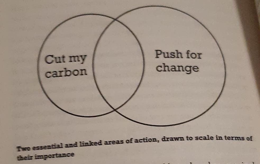 Mike Berners-Lee, this time in How Bad are Bananas? (2020 edition, p194), shows a diagram of two overlapping circles marked ‘cut my carbon’ and ‘push for change’: