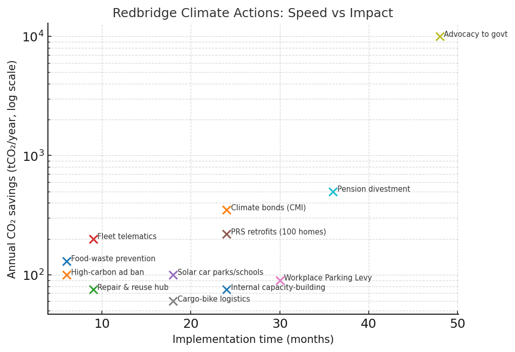 So some kind of balance between practical, direct action and political campaigning, where neither is to the exclusion of the other, for both the individual and the organisation seems healthy. And this balance of actions and words would also apply at levels bigger than individuals and communities, at local authority, national and international level. An interviewee in the documentary ‘The Race is On’ describes ‘polycentric governance’ that recognises each level of self-regulation and action from the micro to the macro. The political-practical distinction does seem to be an issue at local level in Redbridge council’s draft climate plan for 2025-2030: there are actions aiming at bringing council operations to zero carbon by 2030, and others using what influence a local authority has to reduce residents’ transport and heating emissions over a timescale that one would hope is not actually much longer. What it omits is a third element of advocacy and co-operation with outside bodies, to accelerate national policy for housing efficiency improvements and plan for a fair transition to a fossil-free future. In trying to respond to the draft, I have to admit I did take the suggestion to use AI, specifically to find relevant actions in FoE/Ashden council case studies that could make a difference. ChatGPT really ‘tries’ to appear helpful and after being asked about advocacy as an action it volunteered various policies Redbridge could lead London councils on and the diagram above. Note the log scale on the vertical axis – and also that the AIs disagreed among themselves about scale of potential savings, but all three I used suggested that indirect financial and political effects exceeded the proposed rate of PV deployment on public buildings by at least an order of magnitude, with one outputting ‘Advocacy effects are harder to quantify, but even small nudges at central policy level dwarf local project impacts’. Reasonable point.