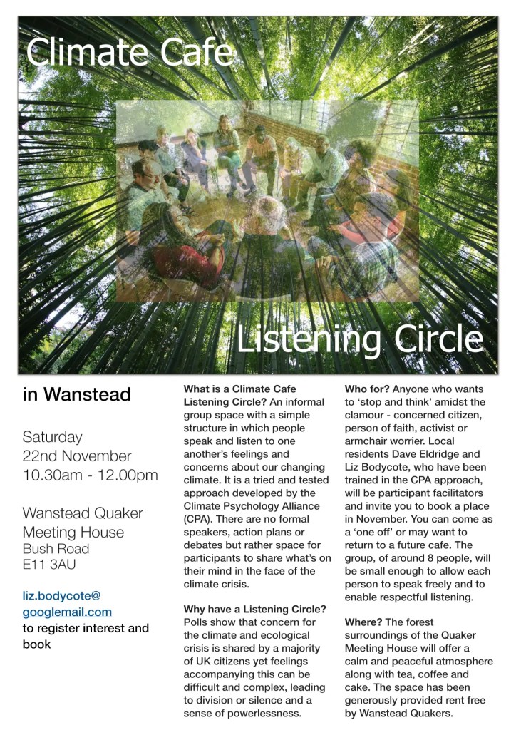 An informal group space with a simple structure in which people speak and listen to one another’s feelings and concerns about our changing climate. It is a tried and tested approach developed by the Climate Psychology Alliance (CPA). There are no formal speakers, action plans or debates but rather space for participants to share what’s on their mind in the face of the climate crisis.