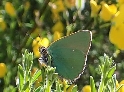 Green Hairstreak Butterfly Callophrys rubi at Wanstead Flats on broom vulnerable to fire