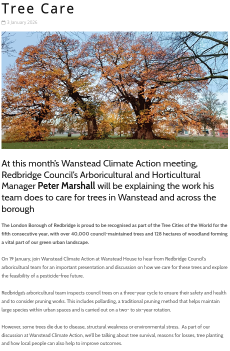 Wanstead Climate Action is delighted to welcome back Peter Marshall, Redbridge’s principal ‘tree officer’, or to give him his full title, Arboricultural and Horticultural Manager. Peter has kindly agreed to give a presentation and answer questions from residents at our 19 Jan meeting, about issues such improving tree care and survival rates and reducing pesticide use on public land. (The group later also no doubt be discussing issues such as local biodiversity policy as our petition progresses through the council.)