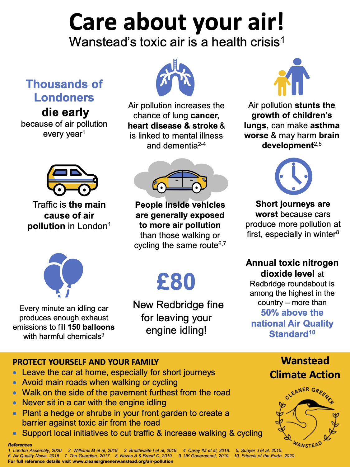 Wanstead Climate Action are ramping up our clean air campaign by encouraging residents to think about the impact of toxic air on their health and that of their families. You can download your own flier here – help us spread the word!