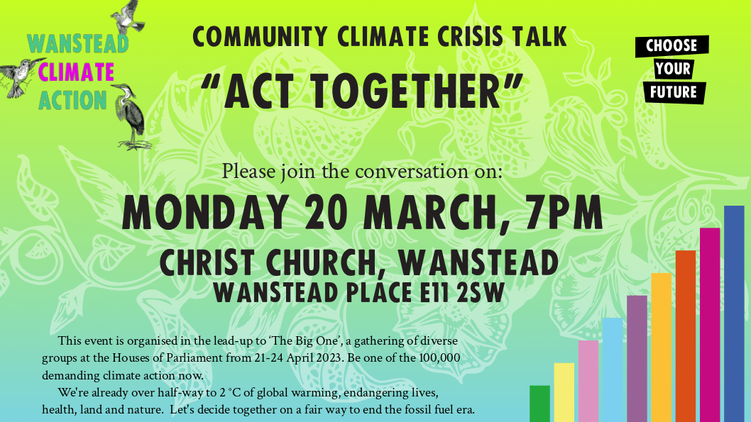 This event is organised in the lead-up to ‘The Big One’, aiming to draw 100,000 people and diverse groups to gather at the Houses of Parliament from Friday 21 to Monday 24 April 2023. Wanstead Climate Action will be joining in this inclusive citizens’ demonstration in Westminster.
